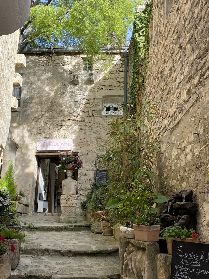 El paseo, siempre en ascenso, revela continuamente bonitos rincones, iglesias y edificios de entre los siglos XVI y XVII, en muchos de ellos hay establecimientos hoteleros, restaurantes y tiendas de recuerdos o de gastronomía de la Provenza francesa como jabones o lavanda.